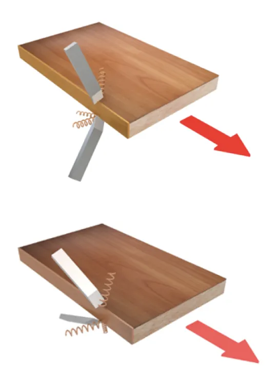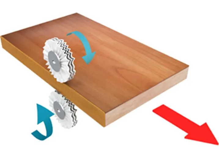 Нанесение кромки с усиленной прижимной силой, чтобы отсутствовали пустоты, и кромка была максимально близко к торцу. Помимо усиленной прижимной силы наше оборудование имеет 4 валика которые прижимают кромку со всех сторон: сбоку, сверху, снизу.
